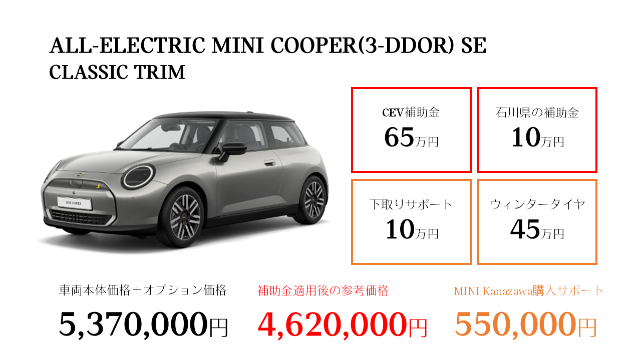 ALL-ELECTRIC MINI COOPERはCEV補助金65万円で石川県の補助金を合わせると75万円。